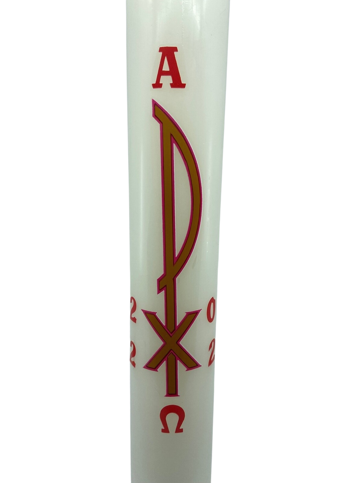 A beautiful 375mm x 54mm white Paschal Candle decorated with a pax, alpha and Omega and liturgical year.
