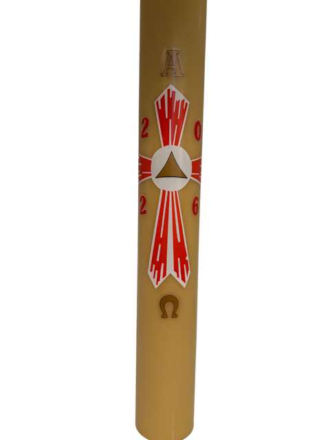 A beautiful 600mm x 74mm beeswax Paschal Candle decorated with a Cross, alpha and Omega and liturgical year.