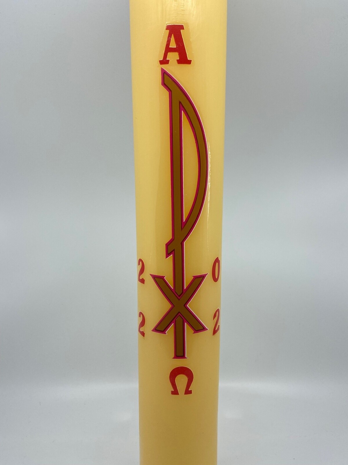 A beautiful 900mm x 74mm beeswax Paschal Candle decorated with a Pax, alpha and Omega and liturgical year.