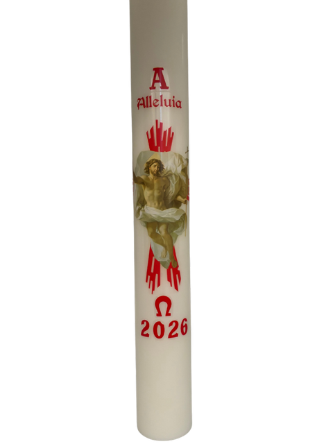 A beautiful 600mm x 74mm white Paschal Candle decorated with a Alleluia, Alpha and Omega and liturgical year.