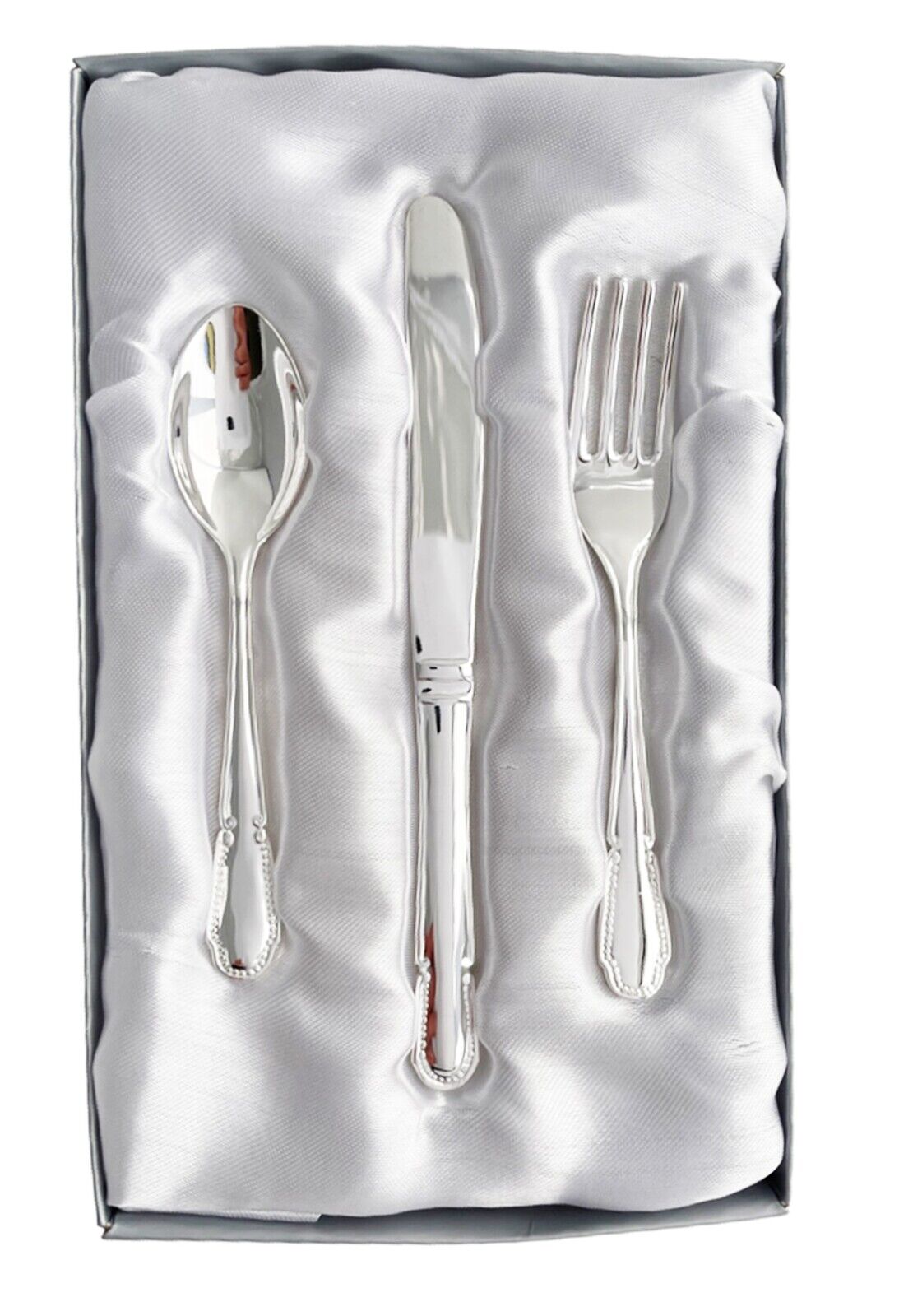 A childrens cutlery set made of silver including, fork, spoon and knife.