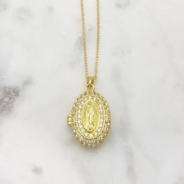 Gold Plated Mary Locket w/Cubic Zirconia