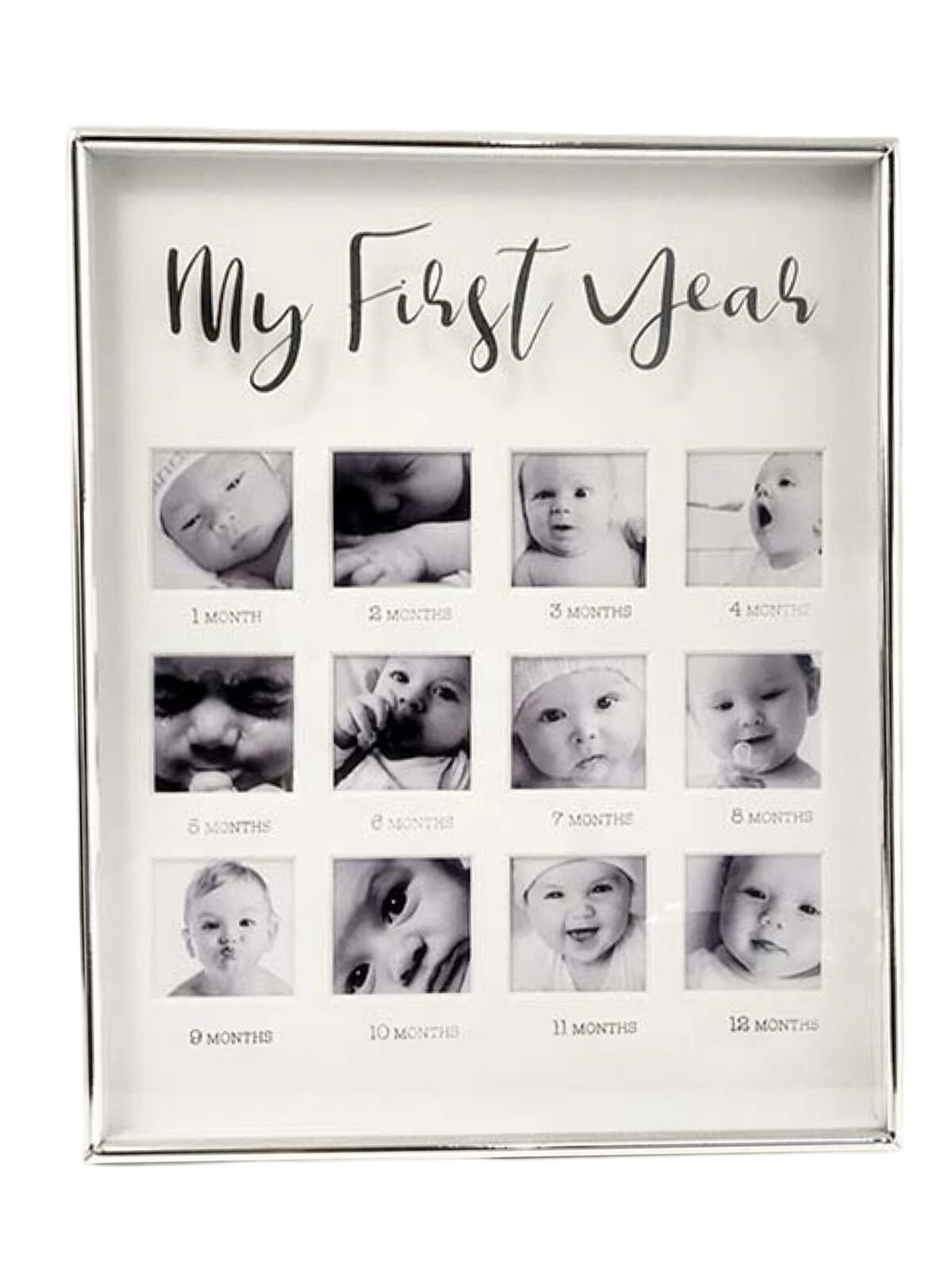 A silver plated photo frame with 12 inserts for the 12 months of your child's first year.
