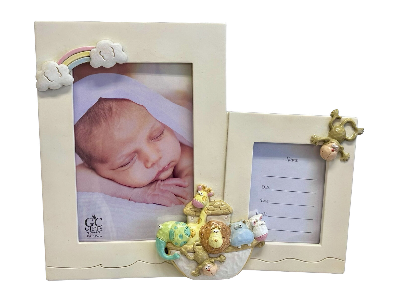 A beautiful resin Noah's Ark double photo frame with space to record the special day, holds a 4 x 6" photo.
