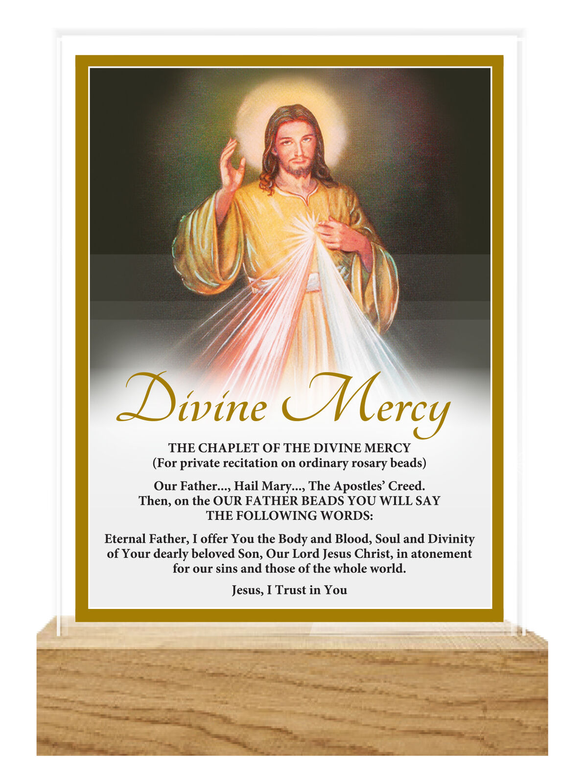 A beautiful glass plaque with religious image and prayer on a wooden base.