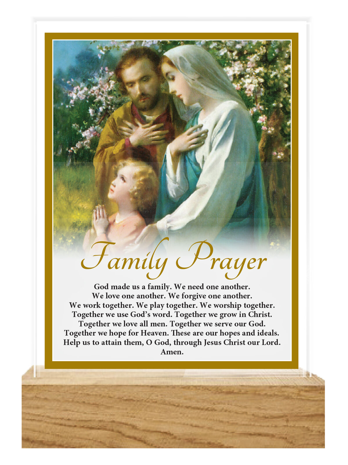 A beautiful glass plaque with religious image and prayer on a wooden base.