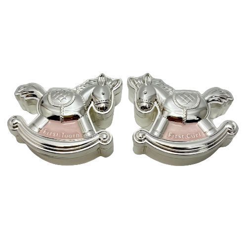 A beautiful First Tooth and First Curl Set shaped as a rocking horse measuring 2-5.1 x 3.8 x 2.3cm.