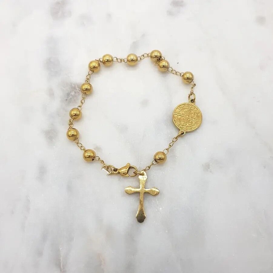 A beautiful gold plated stainless steel rosary bracelet with 6mm beads.  Length is 240mm.