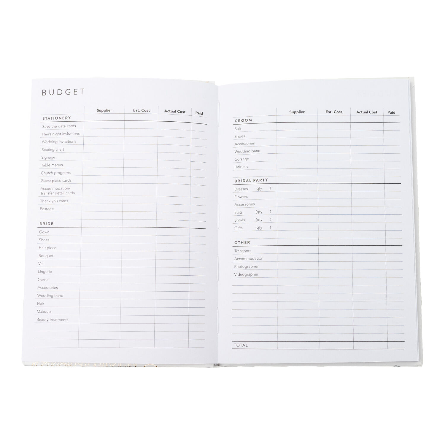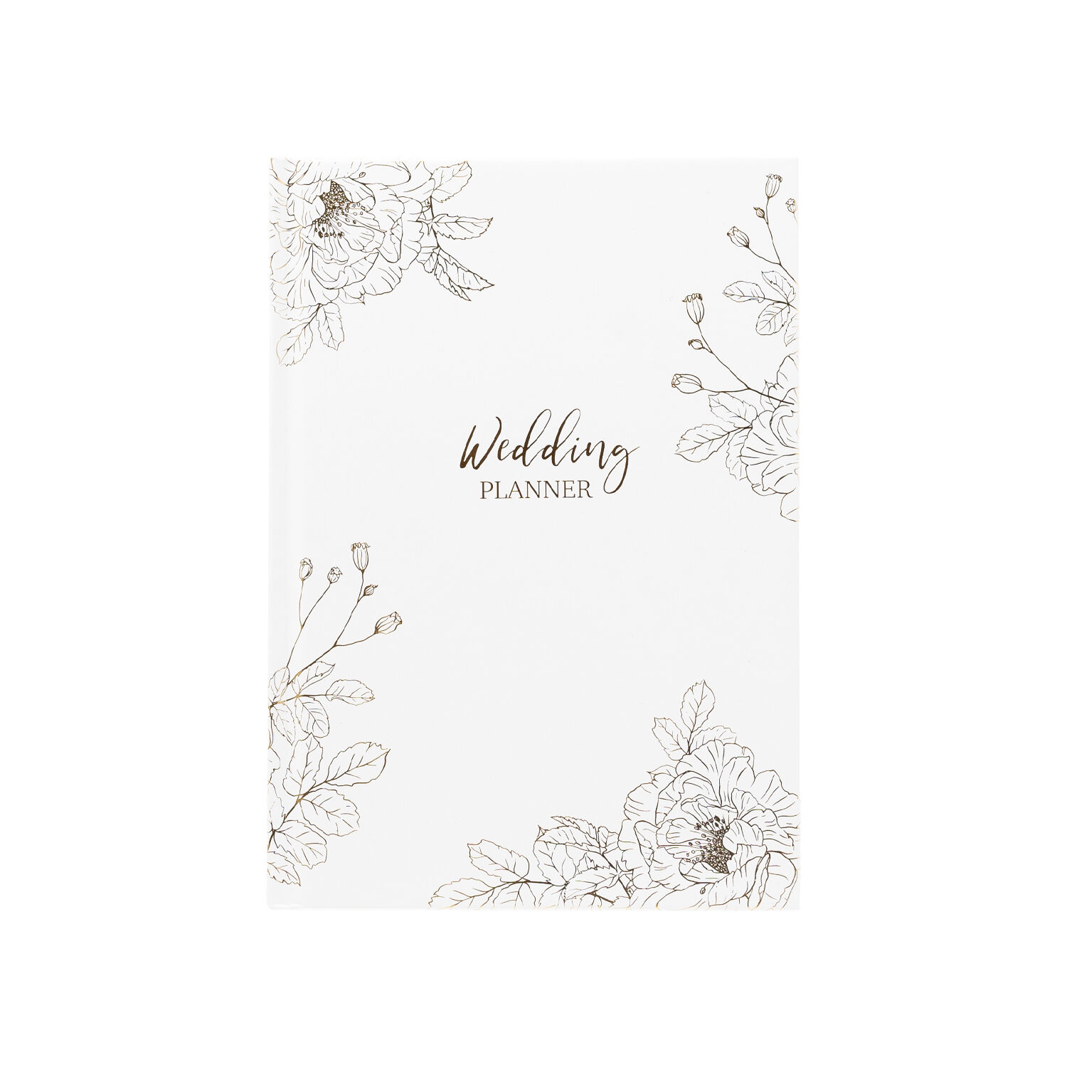 A beautiful wedding planner (A5 hardcover) with gold foil details and unique printed pages.